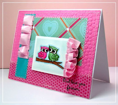 This card is super adorable! I love all those polka dots and the ruffled ribbon! Great job coloring those cute owls, too!